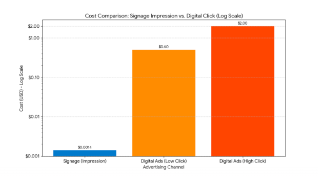 The data highlights that the cost per impression for the example sign ($0.0014) is hundreds to over a thousand times cheaper than the lower end of the digital ad cost per click ($0.50 to $2.00), underscoring the strong long-term return on investment (ROI) of physical signage.